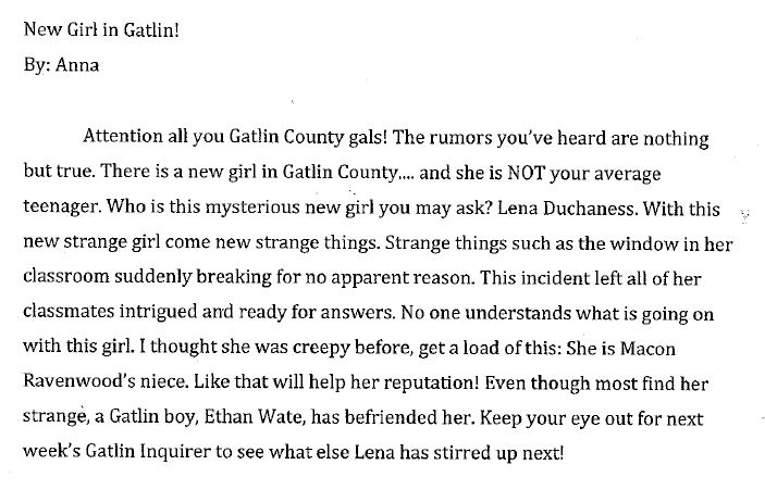 Now, here is some of the featured work of her brilliant students — completing some of those very same alternative assessment assignments for Beautiful Creatures. Check it out: