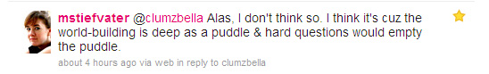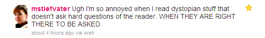 I recently had a micro-conversation about dystopian lit with Shiver author Maggie Stiefvater after she tweeted the following: