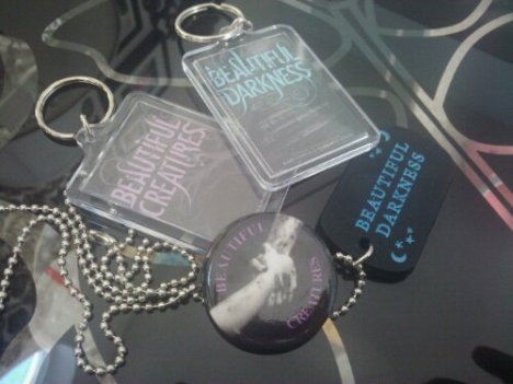 Two (2) first prize winners will each receive a prize pack containing a Beautiful Creatures keychain, a Beautiful Darkness keychain, a Beautiful Creatures button and a Beautiful Darkness dogtag necklace (pictured below) — as well as a Novel Novice button and set of bookmarks.