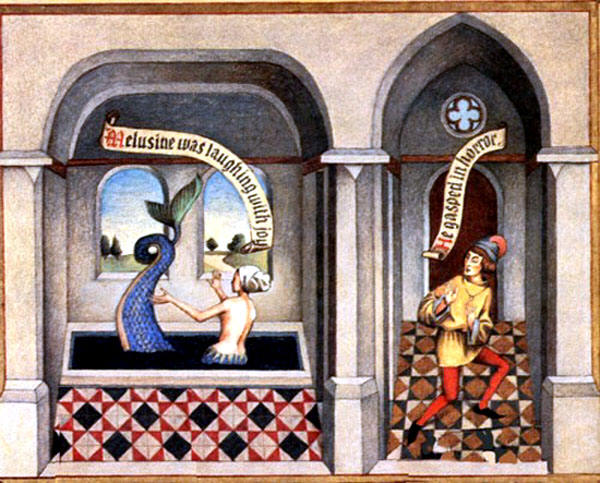 They marry and have a number of deformed but successful children. She builds castles and fortresses, towns and churches, all in a night, as if by magic. They are very comfortable and happy … until Raymond’s brother pays a visit and puts a bug in his ear about what Melusine is doing on Saturdays. He spies on her through a crack in the door and sees her at her bath —