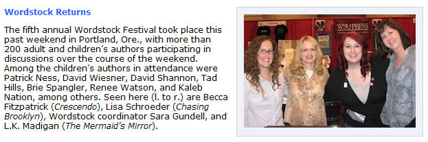 * Publisher’s Weekly featured Wordstock Festival in its Children’s newsletter this week — highlighting many of the children’s & YA authors at the festival, along with a photo featuring Becca Fitzpatrick, Lisa Schroeder, L.K. Madigan and ME (in my role as a Wordstock author coordinator). Yeah, I was definitely doing a major happy dance after discovering this: