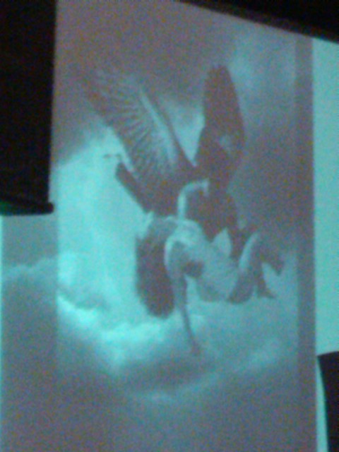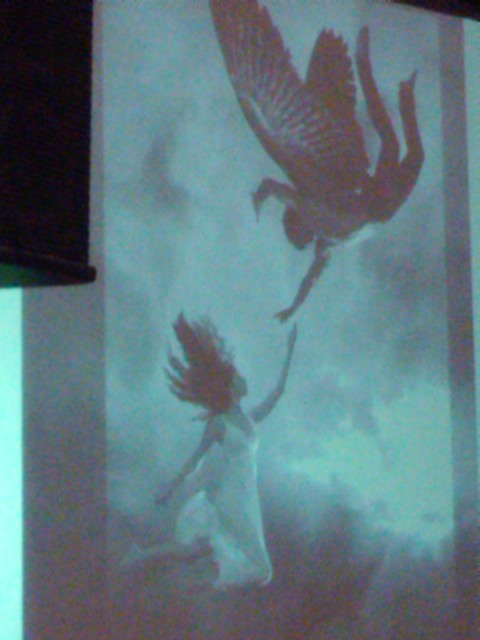 As we all know, the cover of Hush, Hush by Becca Fitzpatrick definitely grabs you immediately — it’s intriguing, dramatic, filled with action — and hey, the hot half-naked guy with wings doesn’t hurt, either. But the cover went through various stages before getting to the final product we’re all familiar with. While she was at Wordstock in October, Becca showed some images of the Hush, Hush cover’s evolution. Here are some of those photos so you can get an idea of how the cover evolved.