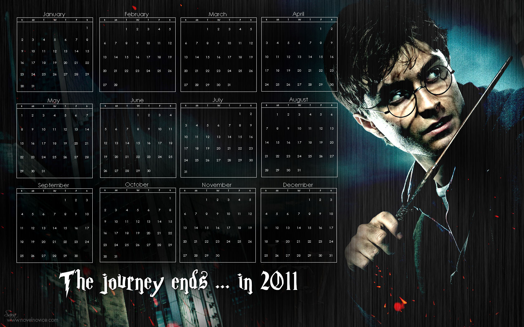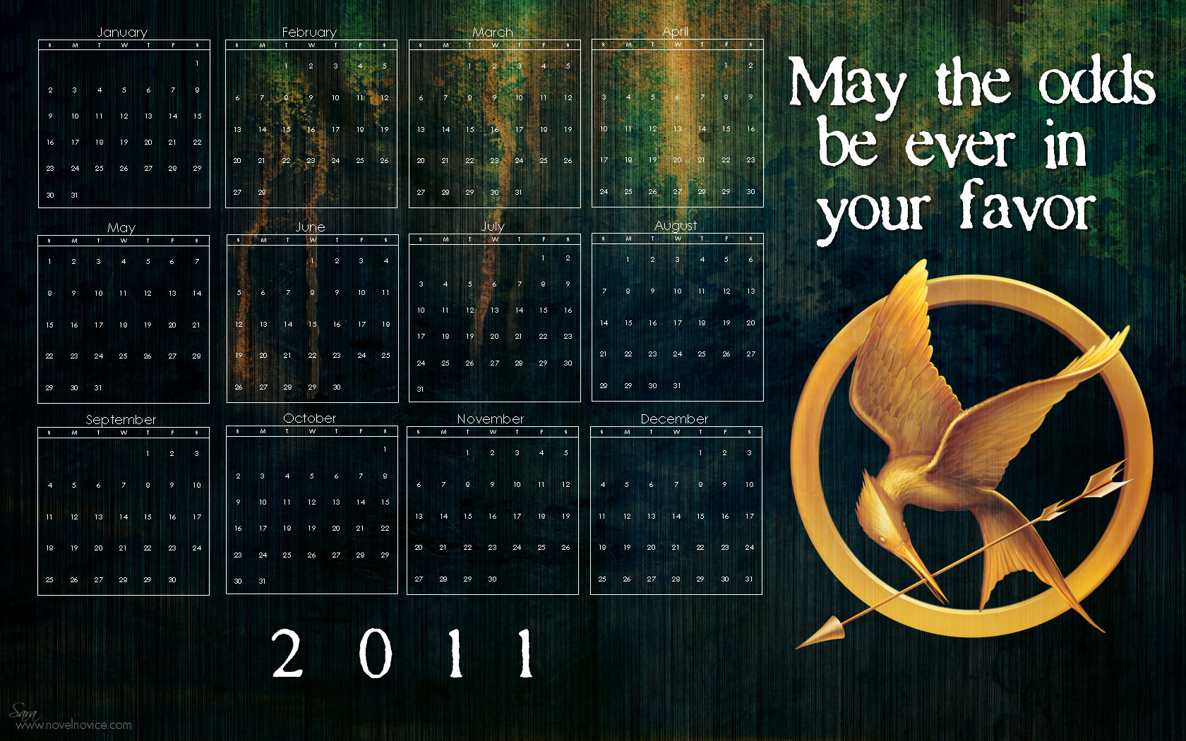Yesterday, we shared with you our 2011 Twilight Saga Desktop Wallpaper Calendars. They are a bit of a yearly tradition for Novel Novice (having started on our sister site, Novel Novice Twilight a few years ago). But we wanted to create a few extra 2011 desktop wallpaper calendars for fans of other book series. So we’ve put together some 2011 yearly calendar wallpapers featuring The Hunger Games, Harry Potter and The Mortal Instruments.
