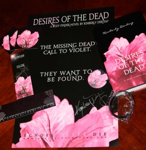 Three (3) winners will each receive a signed copy of Desires of the Dead (courtesy HarperTeen) along with an assortment of Desires of the Dead swag courtesy of Kimberly Derting herself (Plus lots of it is signed, too!) Kim sent us this photo of what each prize pack will look like: