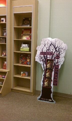 We worked closely with our marketing department on the display. It was tough because we wanted something striking and different. We tried variations with the girl, and others with birdcages and things pulled from our cover design, but they all just looked cluttered. In the end I decided it might be best to do something more graphic, like the withered branches on a tree, and that was the look that clicked.