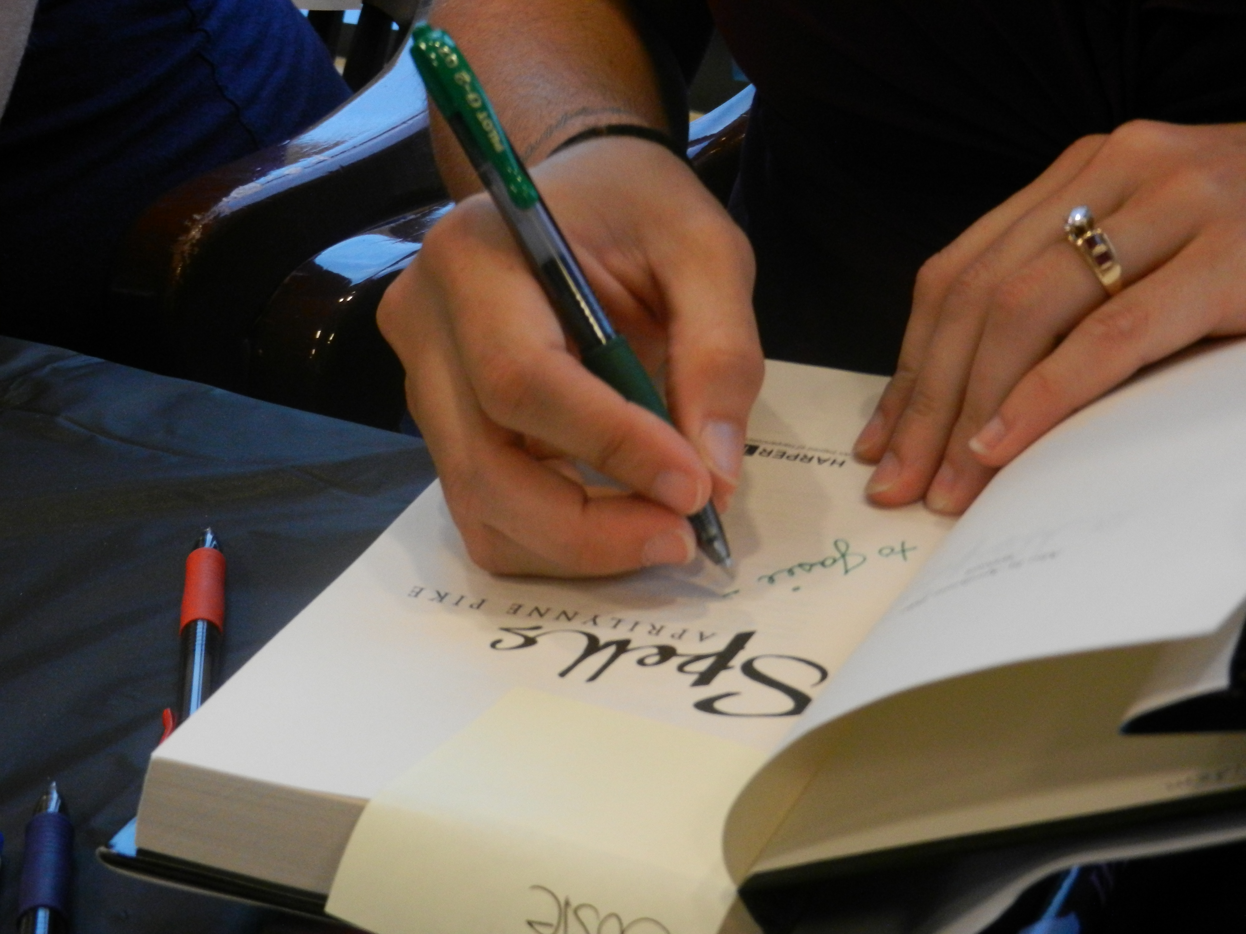 Aprilynne Pike signs a copy of SPELLS for a reader