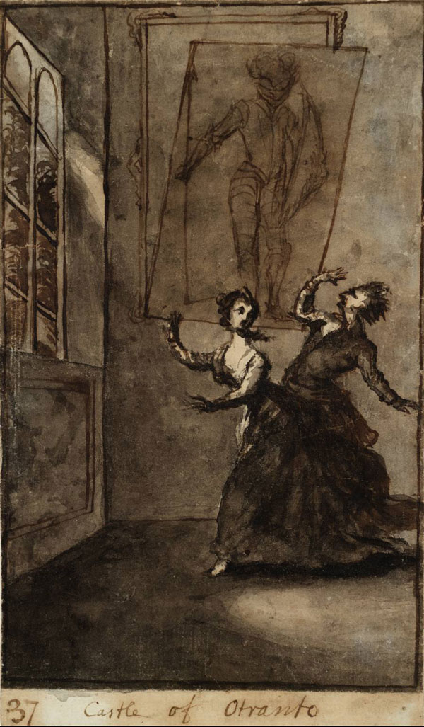 The ghost scene from THE CASTLE OF OTRANTO The Castle of Otranto (1764) by Horace Walpole: The book begins on the wedding day of Manfred’s sickly son Conrad and princess Isabella. Shortly before the wedding, however, Conrad is crushed to death by a gigantic helmet that falls from above. Manfred, terrified that Conrad’s death signals the beginning of the end for his line, resolves to avert destruction by marrying Isabella himself while divorcing his current wife Hippolita. There are a number of misunderstandings, and things don’t end well for Manfred.