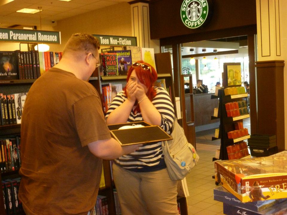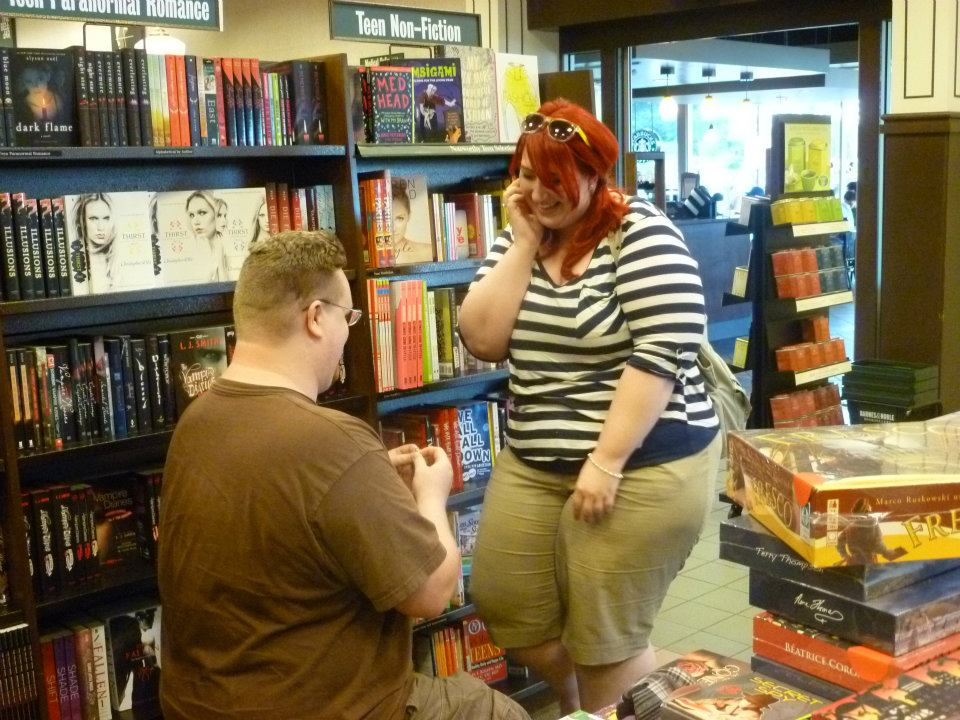 I come around the corner, and on the top shelf is a book box with the words, “Will you marry this lucky guy, Sara?” on it. I literally dropped the book I was holding (sorry, Kat) & started shaking and crying.