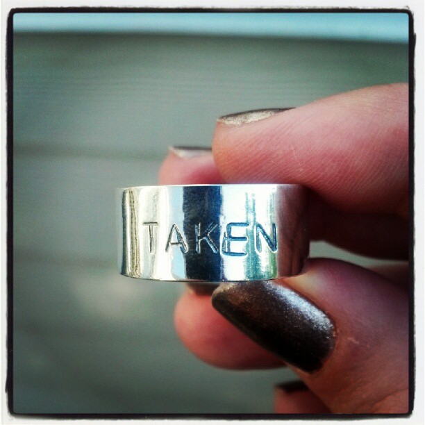 I told Viviane exactly what I wanted — and she created this gorgeous & quirky sterling silver ring that says “TAKEN” on the outside and our upcoming wedding date stamped on the inside. I gave the ring to Derek last night & he laughed so hard when he saw what it said!