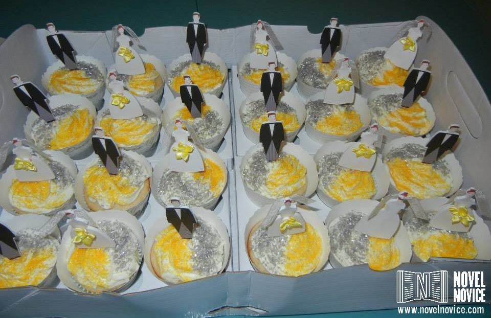 My mom also hand-crafted these beautiful cupcake liners, that she had printed with our wedding illustration and scans from old fairy tale books.