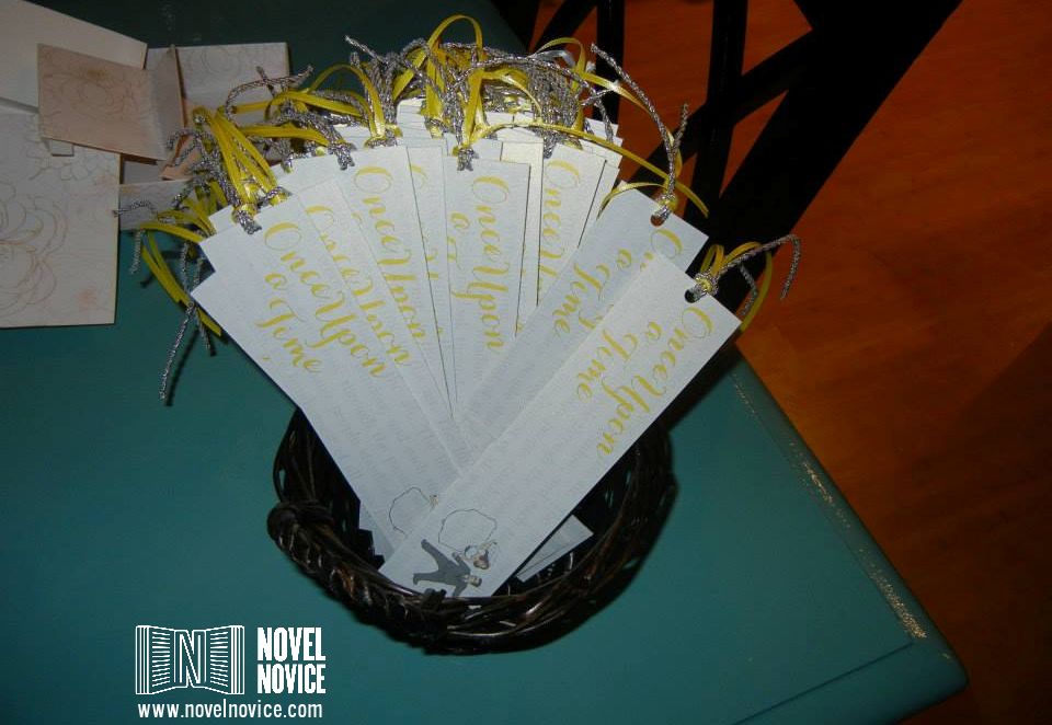For favors, my mom hand-crafted these beautiful bookmarks. The front includes our wedding illustration and scanned pages from a fairy tale book, and the back is made from glitter scrapbook paper.