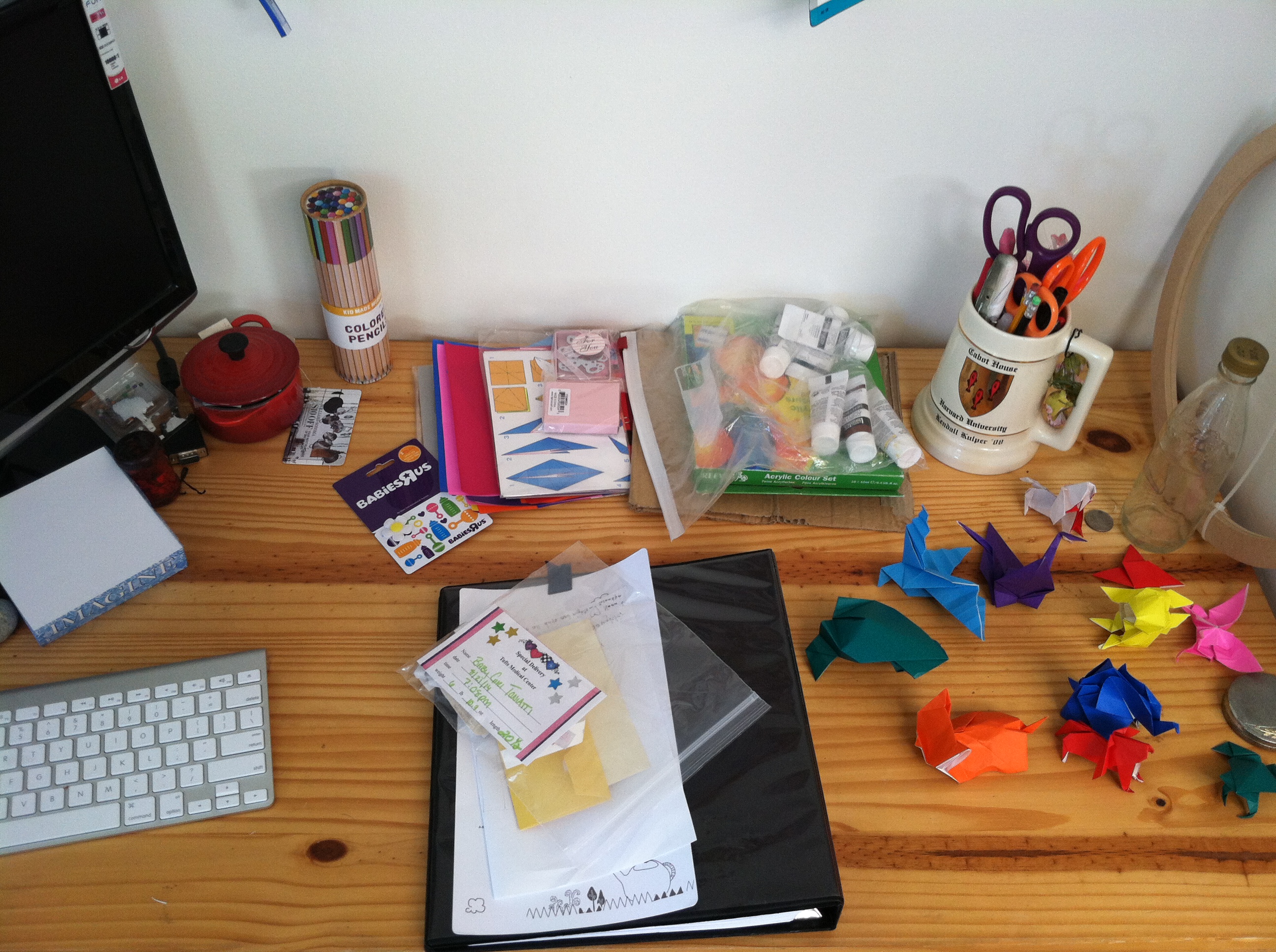 A menagerie of origami animals (which will eventually become my daughter’s mobile), a teeeeeny red LeCrueset pot that I use to store paperclips and odds and ends, my grandmother’s old makeup compact, my personalized beer stein from my college dorm, and lots of cards from friends and family about the new baby.