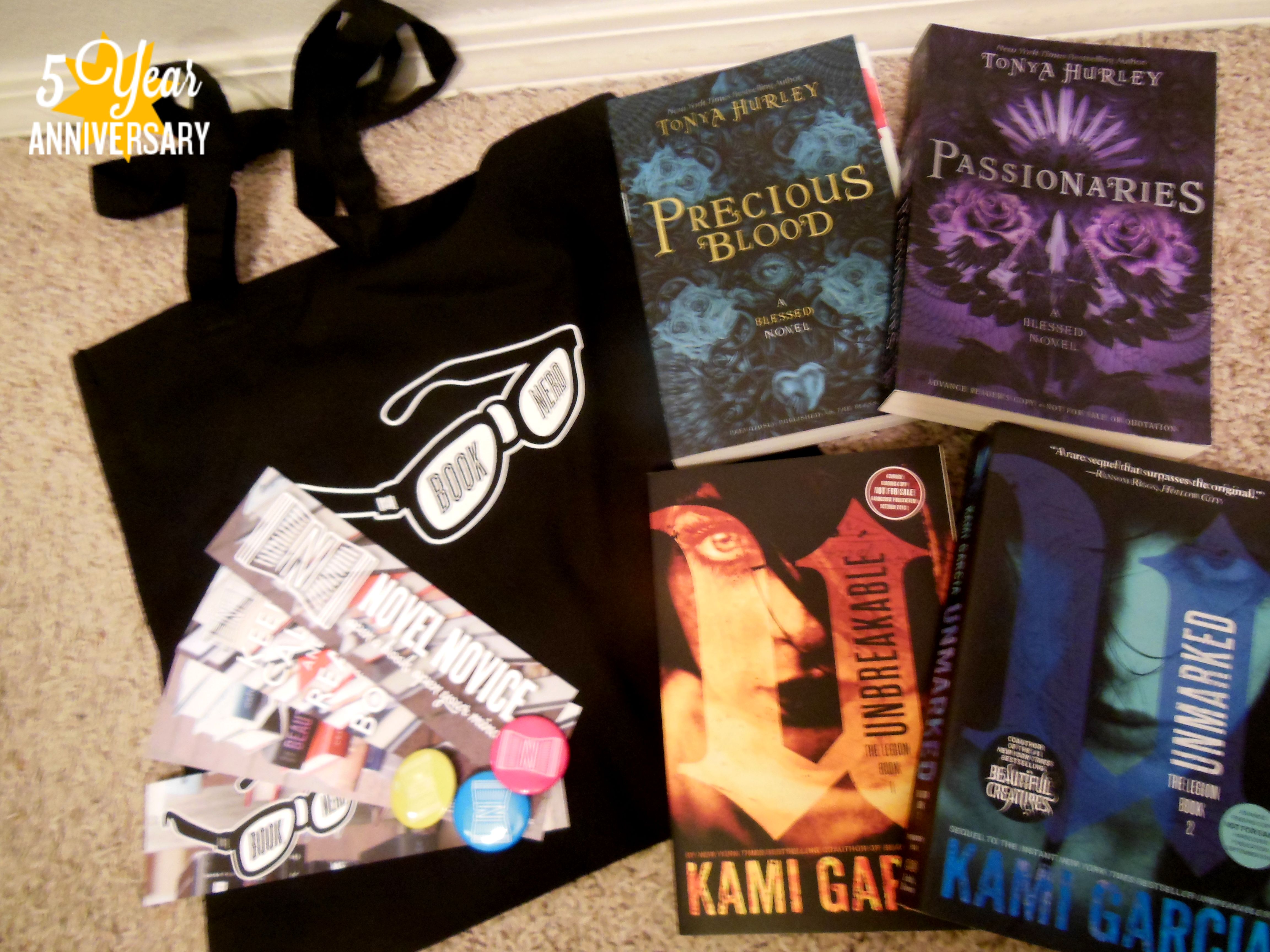 All prize packs also include a Novel Novice “Book Nerd” tote bag, a Novel Novice button (assorted colors) & a set of four Novel Novice bookmarks, plus a random assortment of other YA bookmarks & swag.