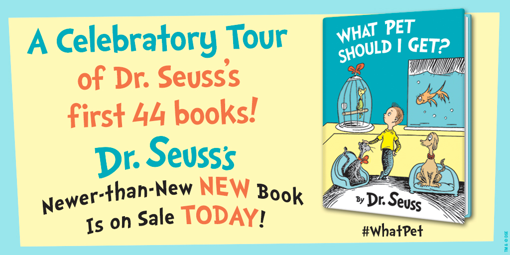 what pet should i getThe manuscript & illustrations for What Pet Should I Get? were discovered in the home of the late author back in Fall of 2013. With today’s publication, it becomes the first original new Dr. Seuss book to be published since 1990’s Oh, the Places You’ll Go.