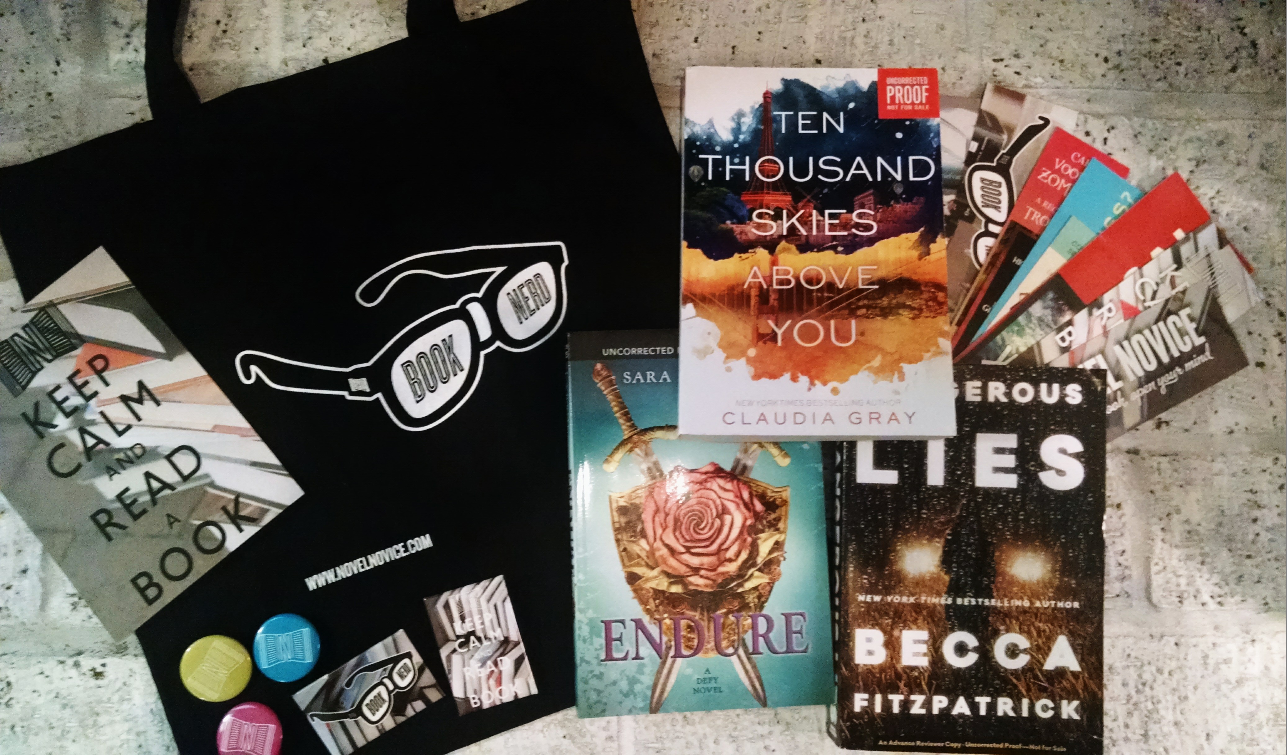 The prize pack will include: copies of Ten Thousand Skies Above You by Claudia Gray, Dangerous Lies by Becca Fitzpatrick, and Endure by Sara B. Larson, as well as a Novel Novice “Book Nerd” tote bag, a “Keep Calm & Read a Book” print, a complete set of Novel Novice buttons, plus bookmarks and assorted swag.