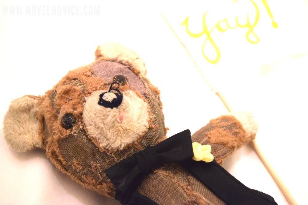 And finally, this guy — Bear Bear. I’ve had this teddy bear since my first Christmas, when I was only 4 months old, and he’s been with me for EVERYTHING — as you can see from his wear and tear. But I still cherish this guy. He’s looking quite dapper here because I haven’t had the hard to change his outfit from when I got married 2.5 years ago, and he was my “something old.” The “Yay!” flag he’s holding is also a keepsake from our wedding; guests waved them after we kissed at the end of our ceremony.